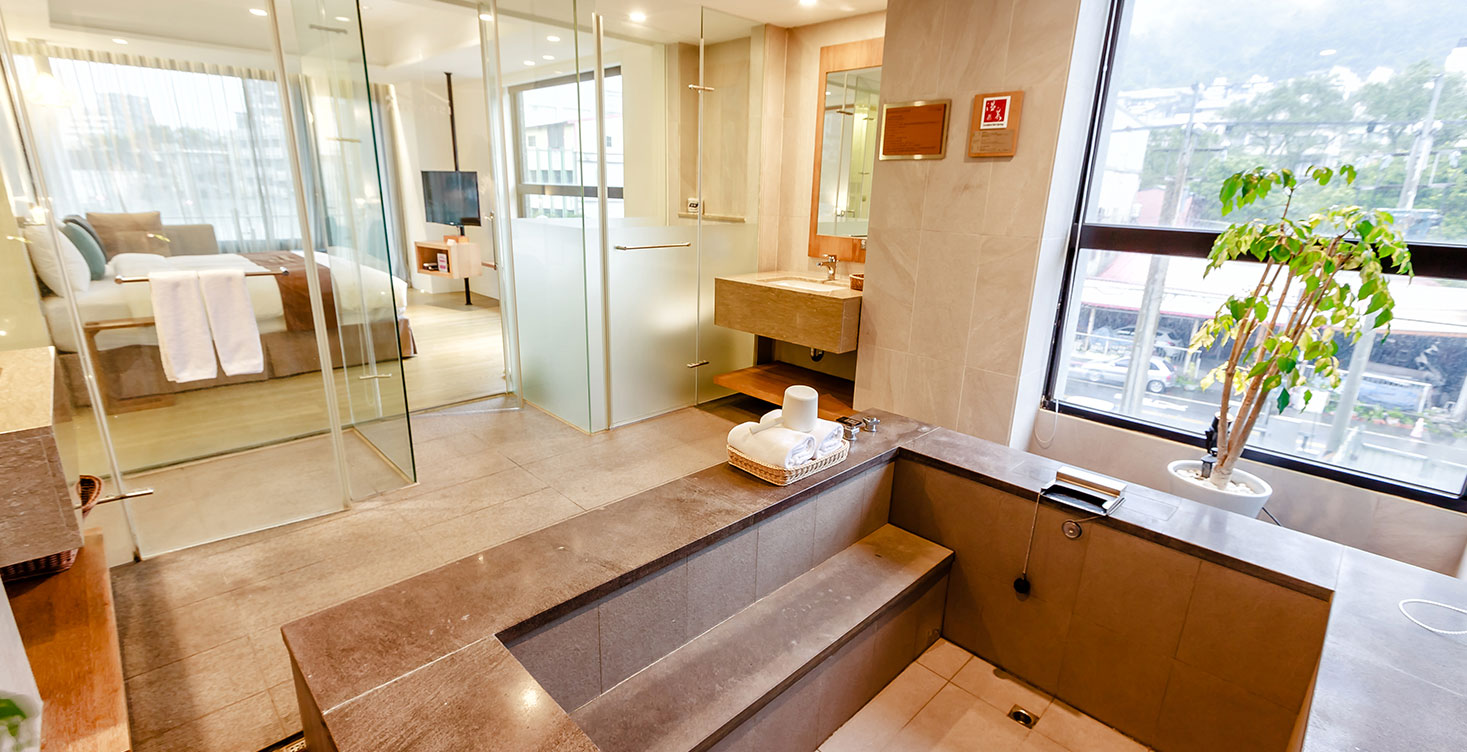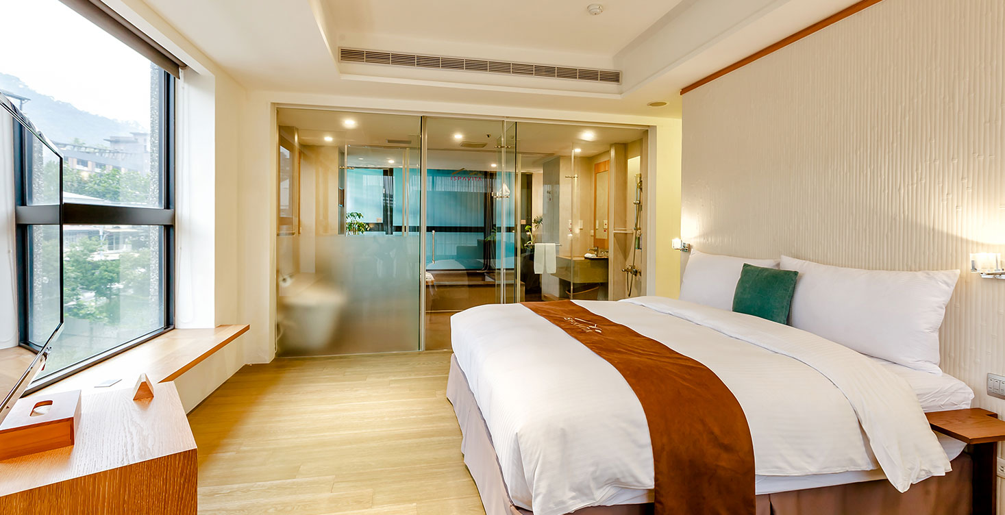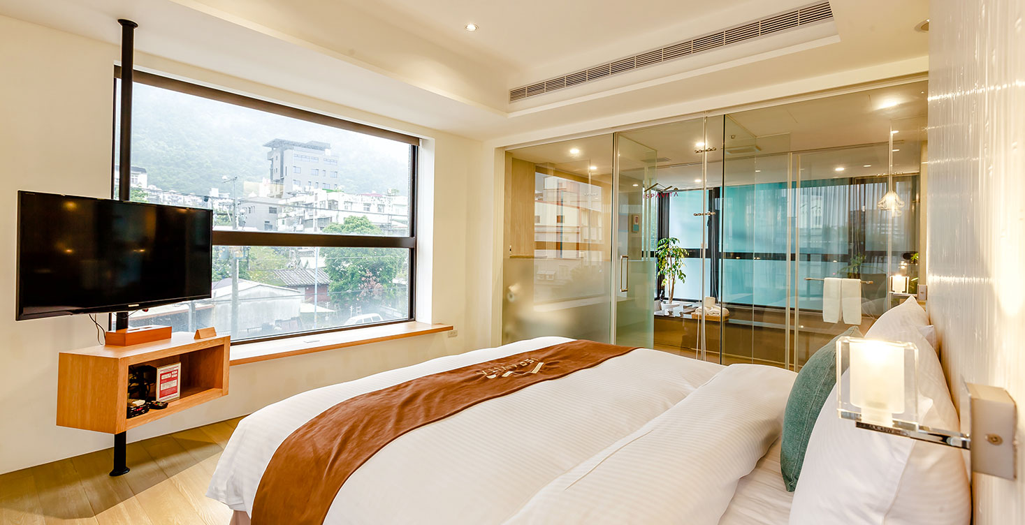 沒有過多華麗裝飾的山邊房,原木設計讓您更加接近真實天然。玻璃空間設計搭配防火設計拉簾,提供無隔闔的穿透視野,簡單的放下亦可成為安全的獨立空間,無論冥想沉思,沐浴原湯,自在悠閒皆不受打擾,靜靜享受山巒日光。